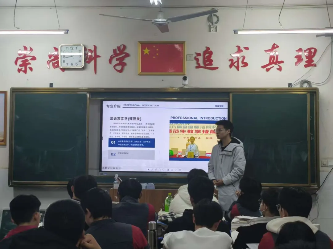 (宣讲团在新建一中教室播放我校招生宣传片) 宣讲会上,团队成员首先系统阐释学校“立足赣西、服务江西、面向全国”的办学定位,并由此介绍了学校的办学历史与整体发展。随后聚焦文传学院,团队具体解读了学院“厚植人文、强化实践、学以致用”的特色培养路径,详细说明了如何通过融合地方文化的课程体系、“创意写作工坊”等创新实践平台以及系统化的师范技能训练,综合培养学生的文化底蕴、专业能力与教学素养。此外,成员们还结合自身在竞赛与实践中的真实经历,具象说明了大学学习与个人成长的紧密关联,为中学学子提供了生动的认知参照。